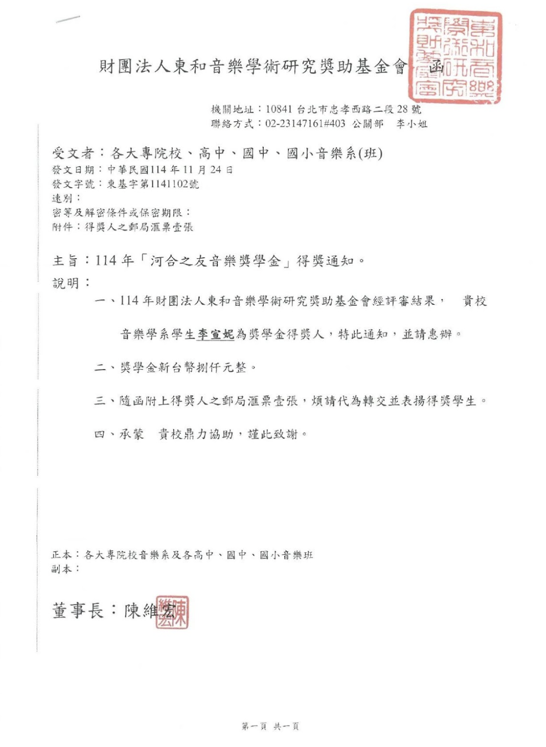 【公告】恭喜李宣妮同學榮獲「114 年河合之友音樂獎學金」