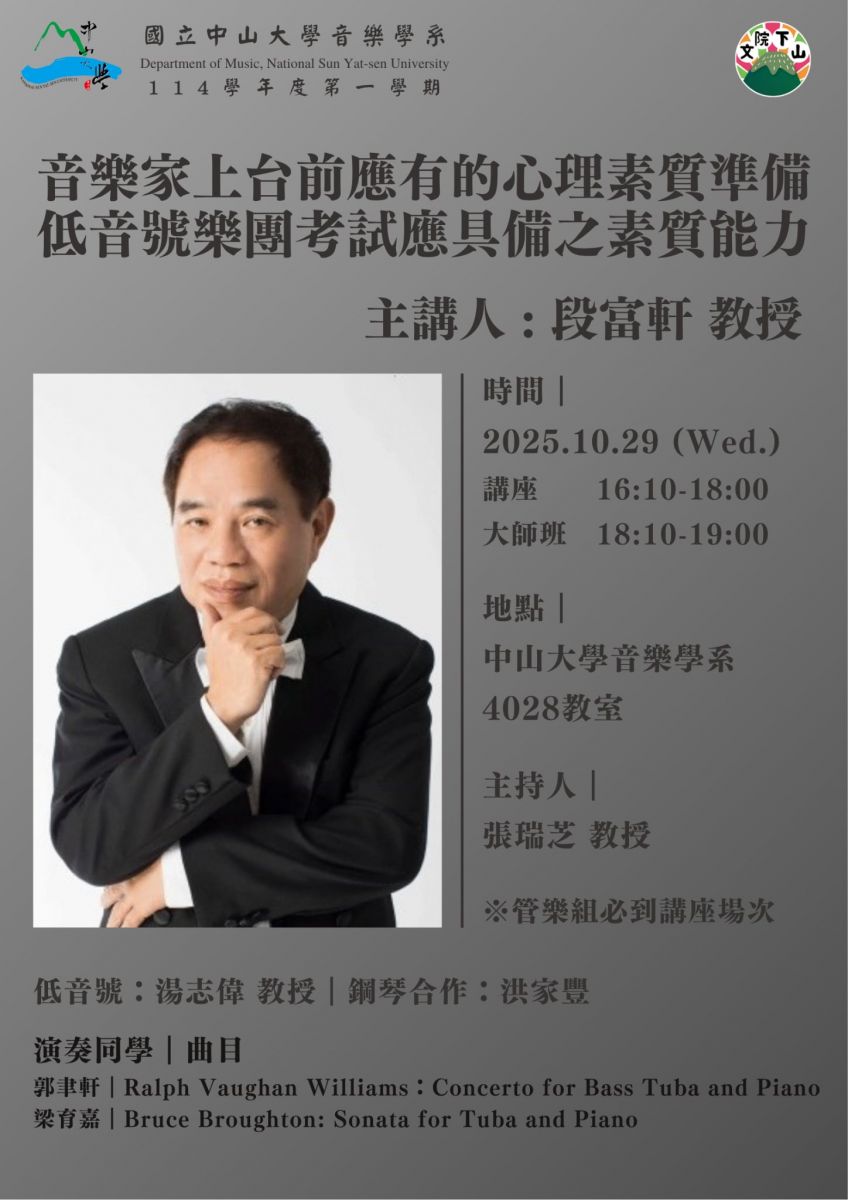 ◆目前任職於中國文化大學藝術學院音樂系專任教授,兼任台師大、台藝大、北藝大低音號主修指導教授。