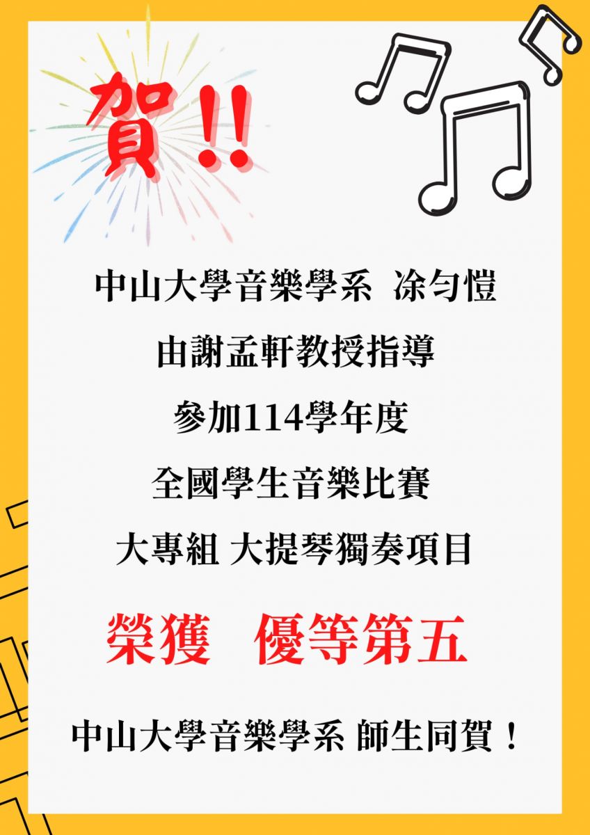114學年度全國學生音樂比賽 凃匀愷同學「大提琴獨奏」大專組榮獲 優等第五